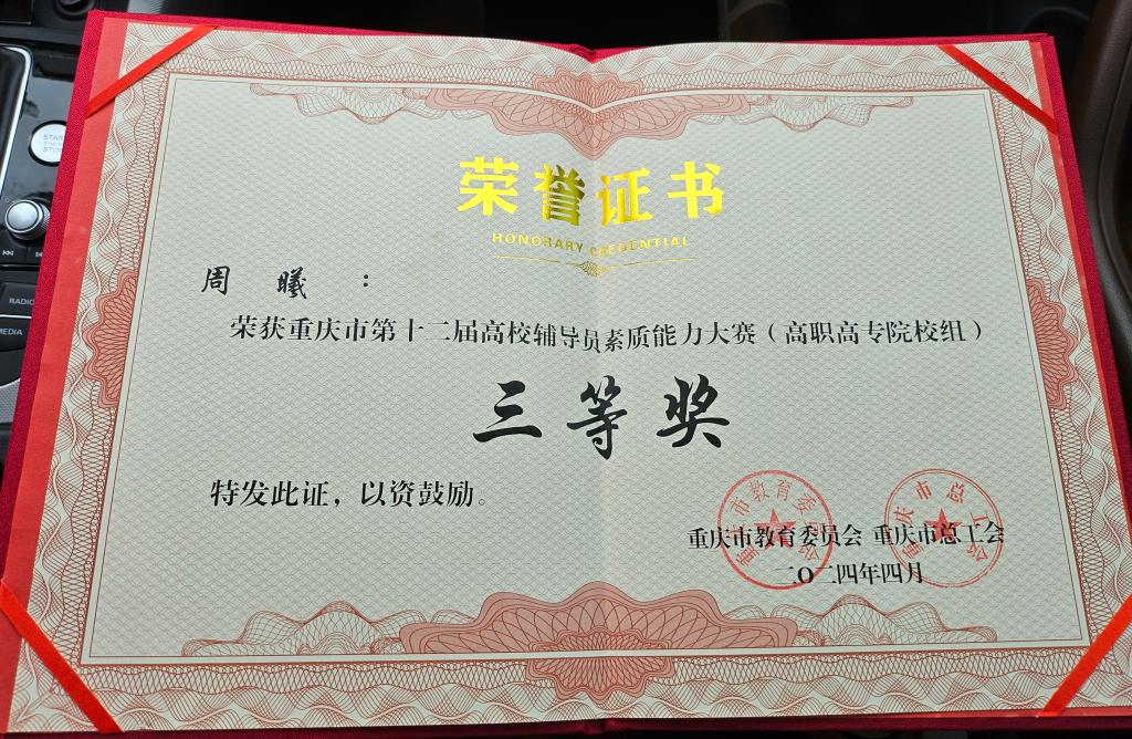 4月1日至3日,由重庆市教育委员会、重庆市总工会联合主办的重庆市第十二届高校辅导员素质能力大赛决赛在重庆理工大学成功举办。我校商务管理学院辅导员周曦在比赛中表现优异,荣获重庆市第十二届高校辅导员素质能力大赛(高职高专院校组)三等奖。
