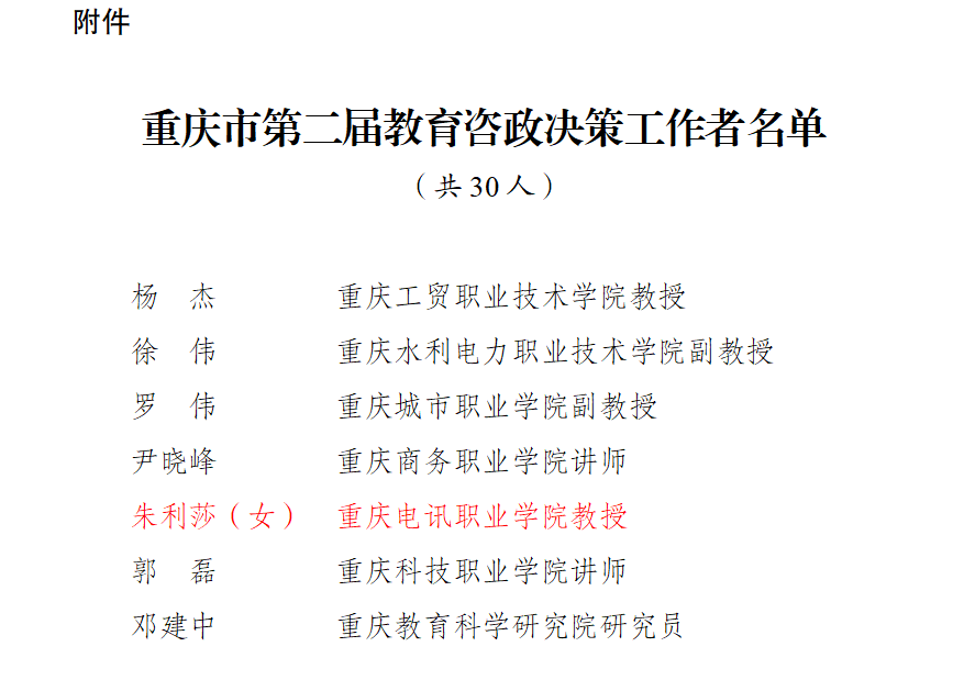 近日,从重庆市教育委员会传来喜讯,我校教师朱利莎凭借扎实的专业素养和丰富的教育研究经验,成功被聘请为重庆市第二届教育咨政决策工作者。这一荣誉不仅是对朱利莎教授个人能力的高度认可,更是我校在教育领域专业实力的有力彰显。