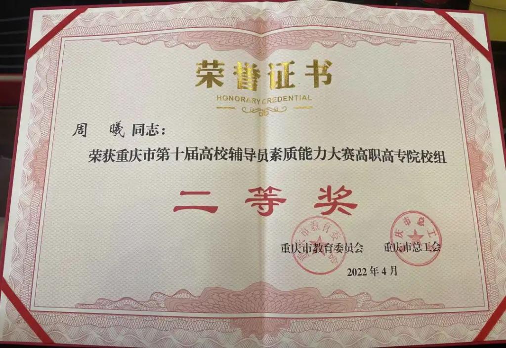 4月25日至27日,由重庆市教育委员会、重庆市总工会主办的重庆市第十届高校辅导员素质能力大赛在重庆文理学院举行。我校商务管理学院辅导员周曦在比赛中表现优异,夺得高职高专院校组二等奖,这是我校在该项赛事中首次获得二等奖的好成绩,实现了我校辅导员在该项赛事上的历史性突破。